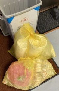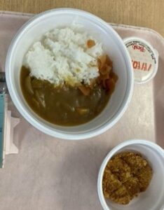 断水中の昼食はカレーでした。食器が洗えないので、使い捨て食器での対応となりました。突然の献立変更でしたが、利用者さんも文句も言わず、協力してくれました。