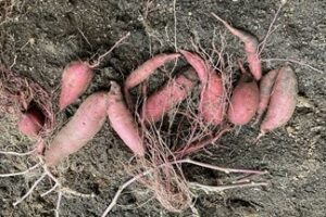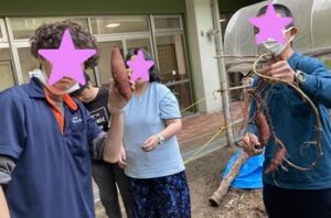 園芸部通信10月 芋ほり ブログ 2025.10.23 園芸部の畝のさつまいも、蔓は何度か収穫し食しましたが、今日はいよいよ芋ほりをすることになりました。小さな小さな畝です。さつまいもができているか不安もありましたが…「あった!」芋を見つけた瞬間、みなさんめっちゃ笑顔です。 そんなたくさんの量ではありませんが、育ててくれた園芸部のみなさんとありがたくいただきたいと思います。