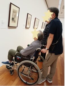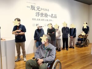 芸術の秋 ブログ 2025.10.23 先日までの残暑がまぼろしだったかのように一気に秋めいて涼しくなってきました。リハビリ班のみなさんと北九州市立美術館へ絵画鑑賞にでかけました。リハビリ班さんは浮世絵アートの作品作りをしています。ちょうど美術館が「版元からみる浮世絵の名品展」をしているというので、お勉強も兼ねて、とてもいい外出の機会となりました。 絵画をみることってあまりないと思いますが、今自分たちがやていることと重なるので、みなさん興味津々で見学されていました。次のリハビリ班のみなさんの作る作品も楽しみです。