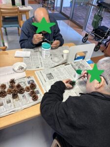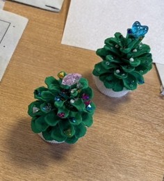 それに色を付けて、ビーズなどの飾りつけをしてクリスマスツリーならぬ、松ぼっくりツリーを製作しました。