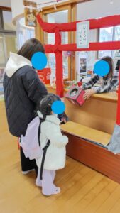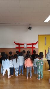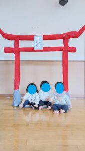 久しぶりに保育園に来て、手作りの鳥居を見て、「神社だ!」と目を輝かせていました😊