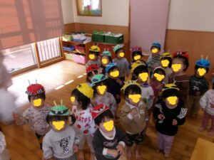 2月3日は節分の日ということで、三萩野保育園にも足立山から青鬼と赤鬼がやってきました。前日に届いた鬼からの手紙に少し不安になる子どももいましたが、「心の中にいる鬼(友達の玩具を取ったり、意地悪したり・・・)をみんなでやっつけようね」と話をすることで、「頑張る!」「みんなを守る」という声が聞こえてきました!
