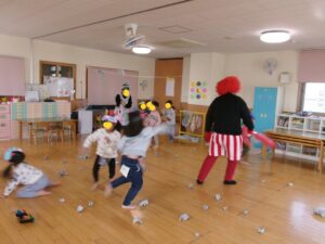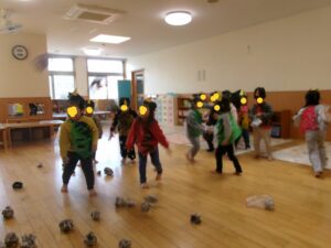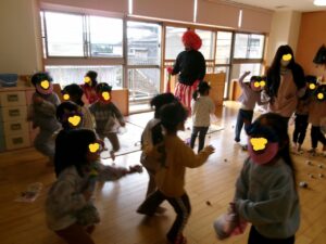 やる気満々で迎えた節分当日、どこからか鳴り響く太鼓の音と鬼の姿に子ども達はびっくり😮鬼をやっつけようと保育士と一緒に豆(新聞紙)を一生懸命投げる子ども達!