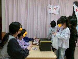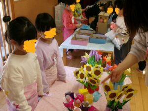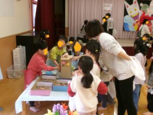 今日はまつ組さんと広徳保育園のゆり組さんとの交流でお買い物ごっこがありました。「みはぎのしょうてんがい」というテーマで「お花屋さん・アクセサリー屋さん・的当て・ガチャガチャ・三萩野神社・たこ焼き・お寿司・おでん・ケーキ・ファストフード」のお店を準備しました。