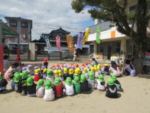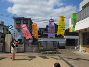 こいのぼり集会を行いました。 ブログ 2026.04.16 新入園児さんも参加する行事は初めてでしたが、天気も良く、嬉しそうに園庭に出て集会に参加することができました。「こどもの日ってなんだろう?」「こいのぼりってなんで飾るのかな?」等クイズ形式で知ることができました。最後は元気よく泳ぐこいのぼりを見ながら「こいのぼり」を歌いました。