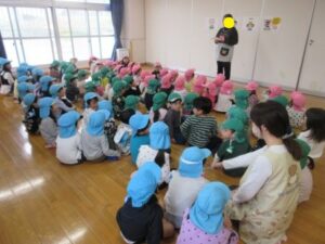 ぞうぐみ、きりんぐみ、ぱんだぐみの子ども達は「子どもの日」の由来を聞きました。そのあとは、園庭に出てこいのぼりをロープにつけて……みんなのこいのぼりが園庭に上がりました。「やねよりたかいこいのぼり~♪」と歌のように泳ぎはじめると「わぁぁぁ~!」と大喜びの子ども達。「ぼくの見つけた」「わたしのあった!」と空を見上げてこいのぼり鑑賞を楽しみました🎏