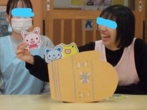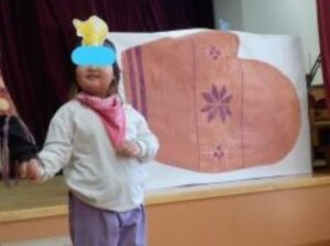 誕生児の子ども達🧒が参加した“てぶくろ🧤”の劇では、おじいさん🧓が落とした手袋に動物がたくさん入って入れず困っていると「入れてあげて😋」と応援していました🤗