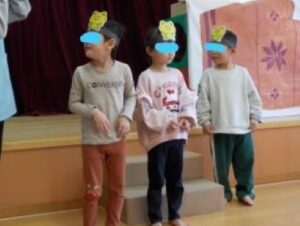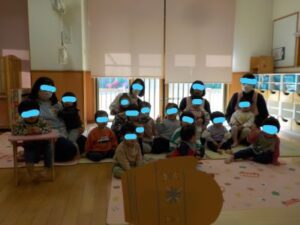 誕生児の子ども達🧒が参加した“てぶくろ🧤”の劇では、おじいさん🧓が落とした手袋に動物がたくさん入って入れず困っていると「入れてあげて😋」と応援していました🤗