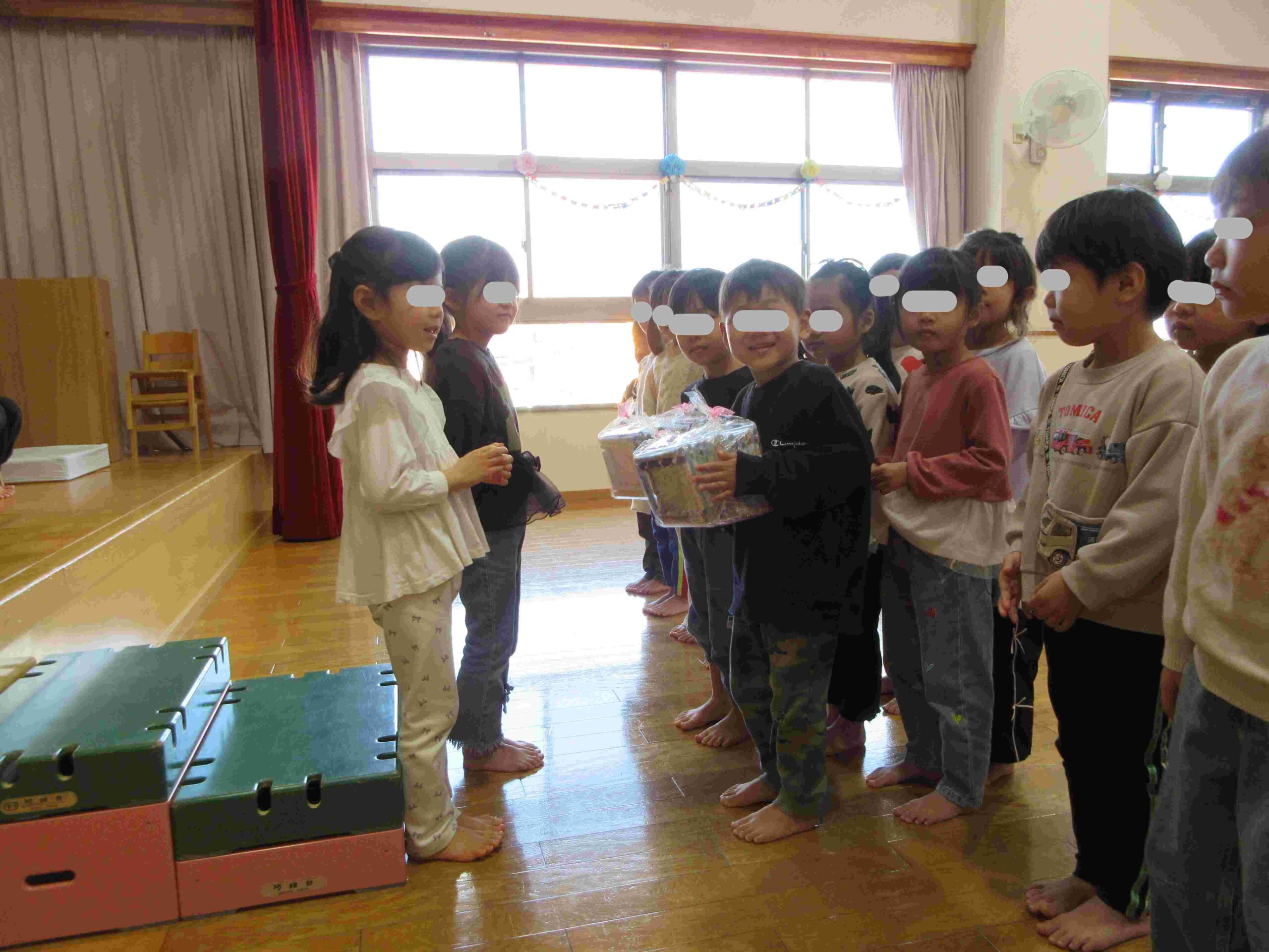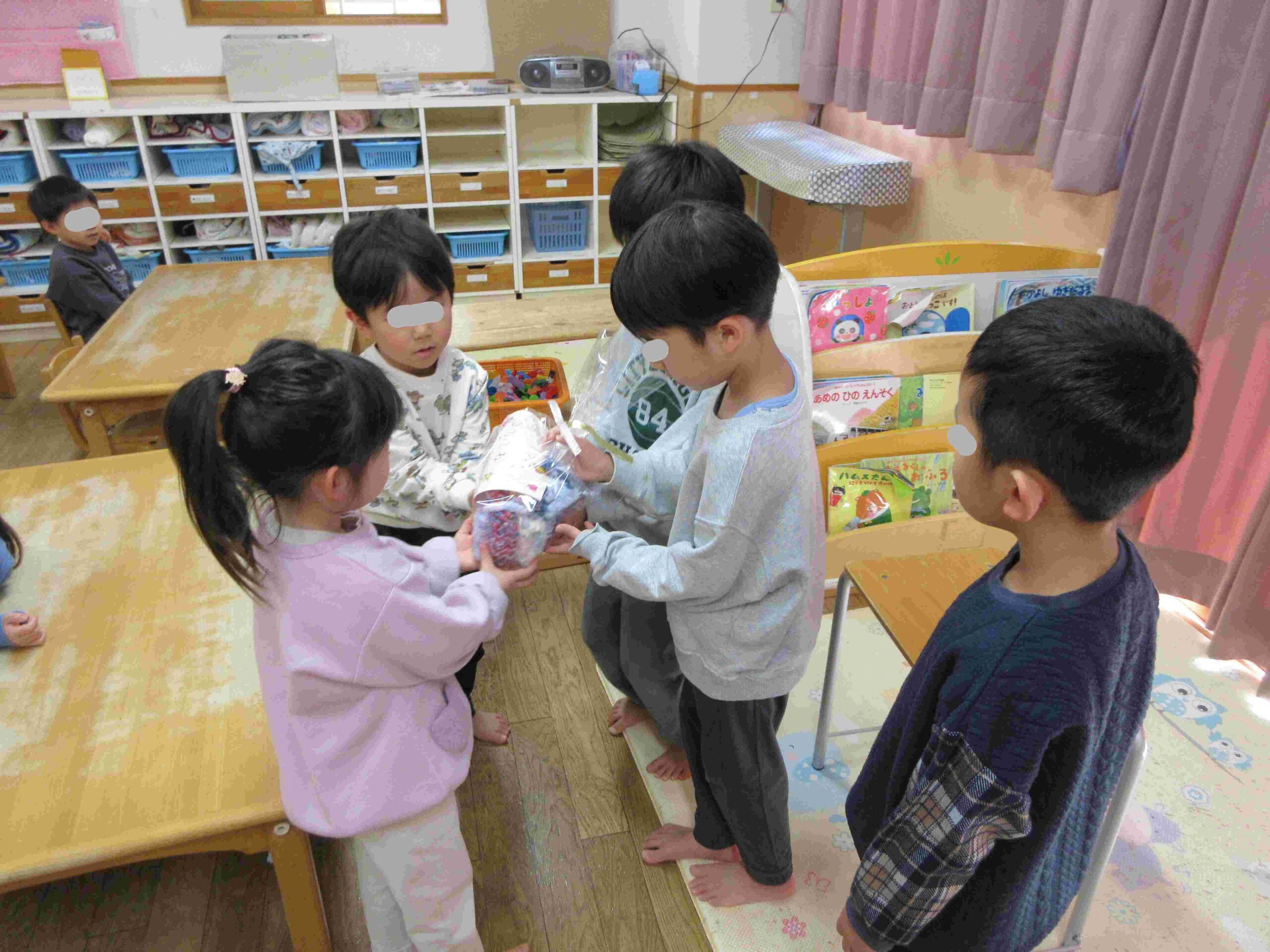 また、年長児から各クラスへのプレゼントは手編みの手提げバックです!みんなで大事に使いたいと思います♡