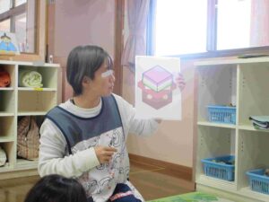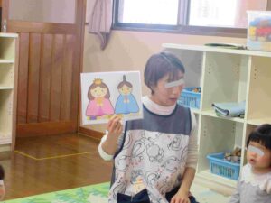 誕生児をお祝いした後は、ひなまつりの由来やひなかざりについて話をしました。ひなかざりの名称当てクイズでは、「はい!」「わかる!」と積極的に手を挙げて答える子どもたちです☆