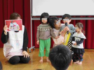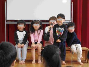 子ども達が製作したひな人形を紹介しました。クラスごとにどのように作ったのかを発表してもらいました。どのクラスも可愛いひな人形ができていました🎎☆