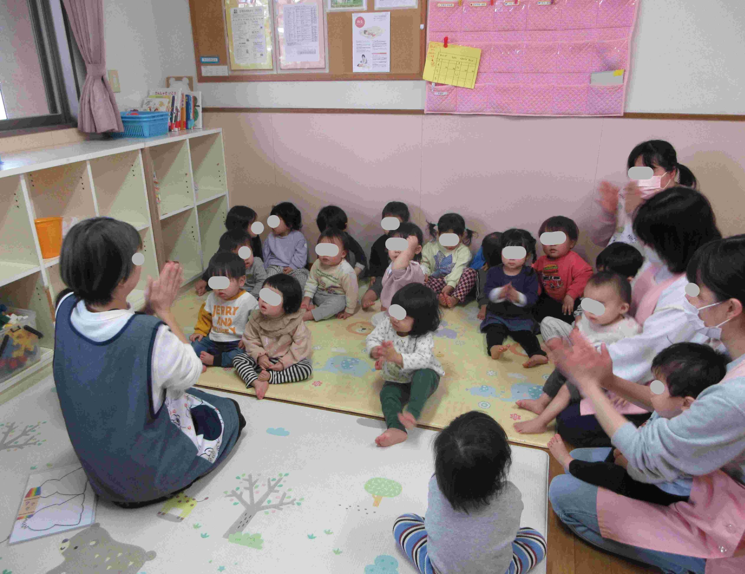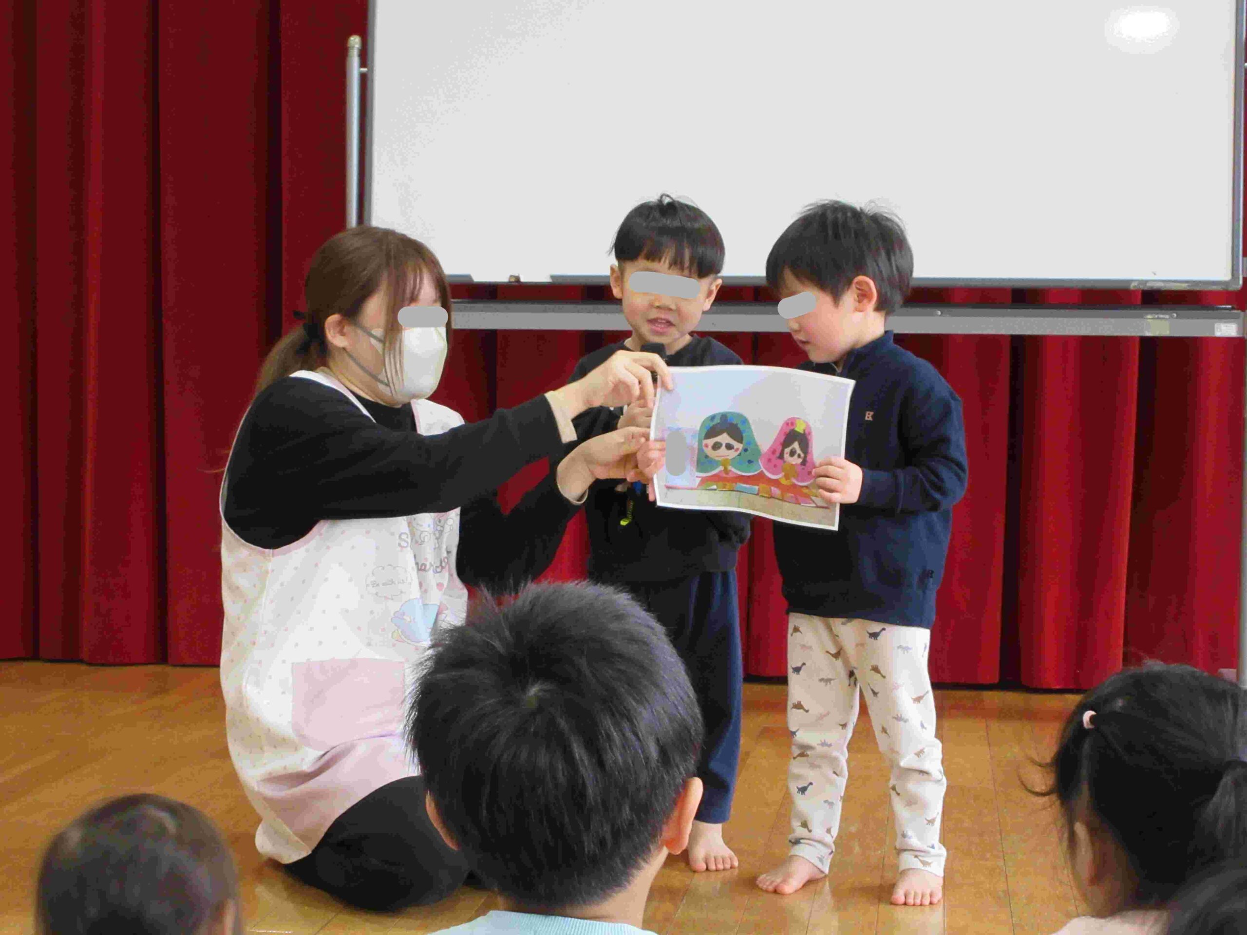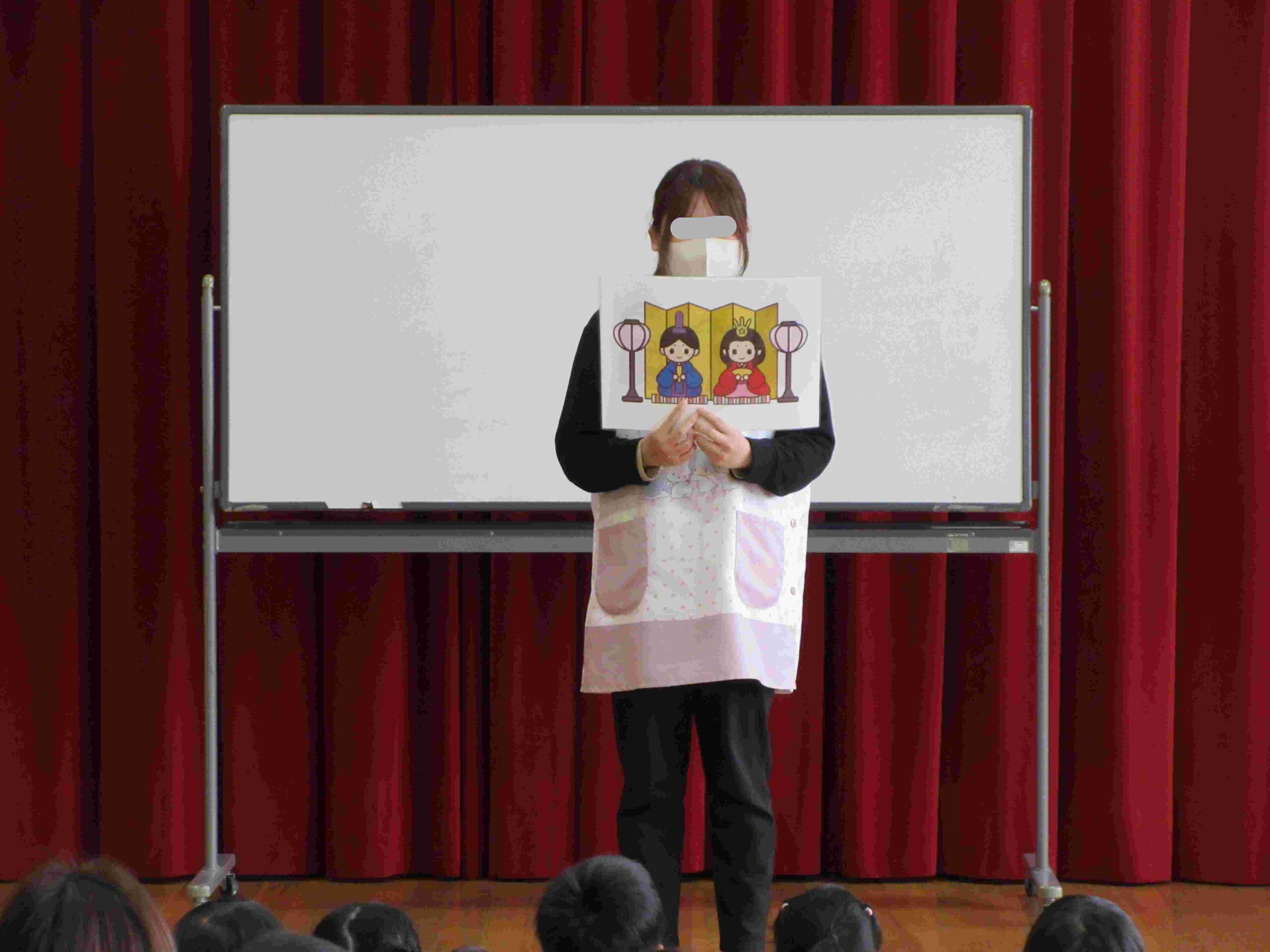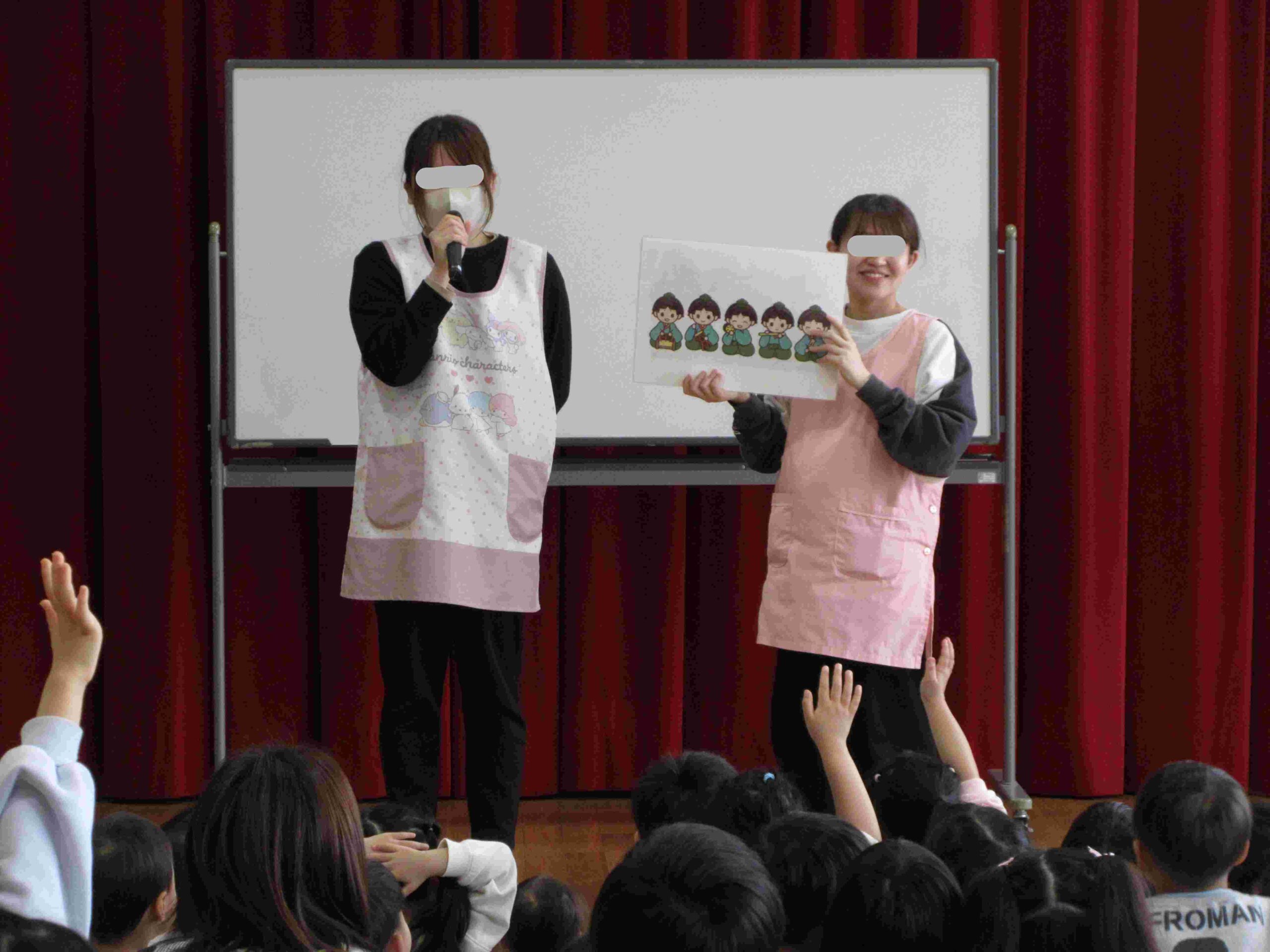 誕生児をお祝いした後は、ひなまつりの由来やひなかざりについて話をしました。ひなかざりの名称当てクイズでは、「はい!」「わかる!」と積極的に手を挙げて答える子どもたちです☆