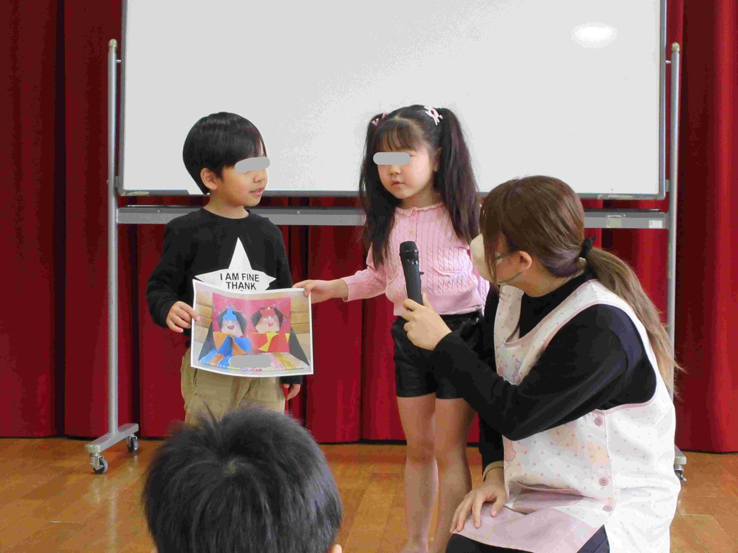 子ども達が製作したひな人形を紹介しました。クラスごとにどのように作ったのかを発表してもらいました。どのクラスも可愛いひな人形ができていました🎎☆
