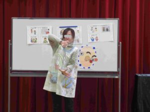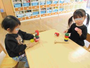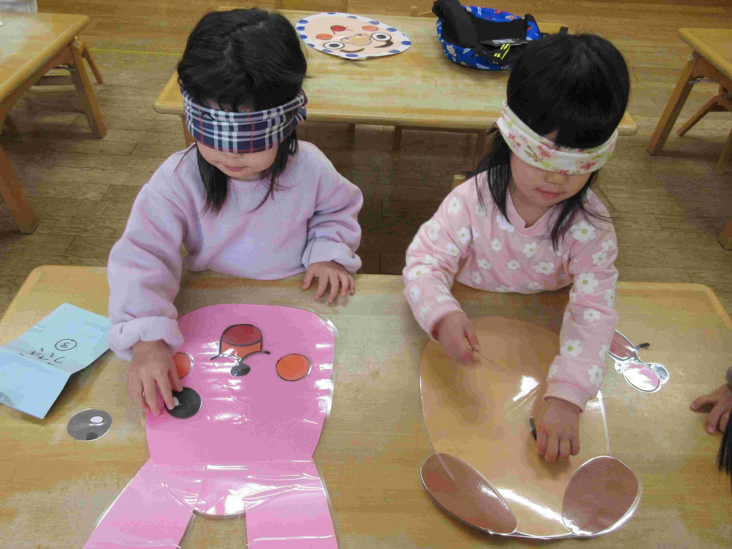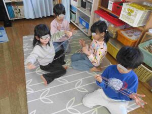 伝承遊びは、福笑いやあやとり、だるまおとしなど昔からある遊びを紹介しました。「なにそれ、なにそれ」と興味津々に聞く子どもたち。遊びの名前や遊び方を知らせると「やりたい!」「たのしそう!」と良い反応を見せてくれました☆
