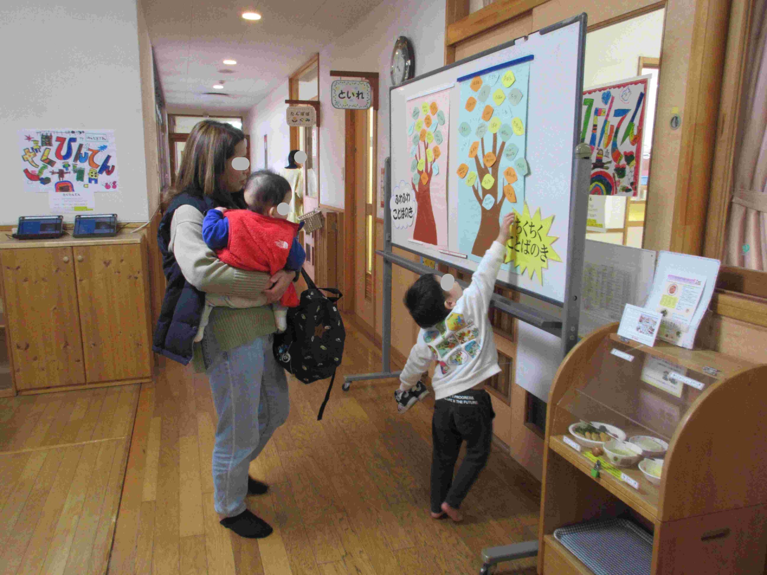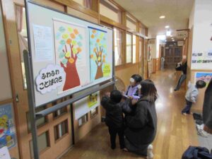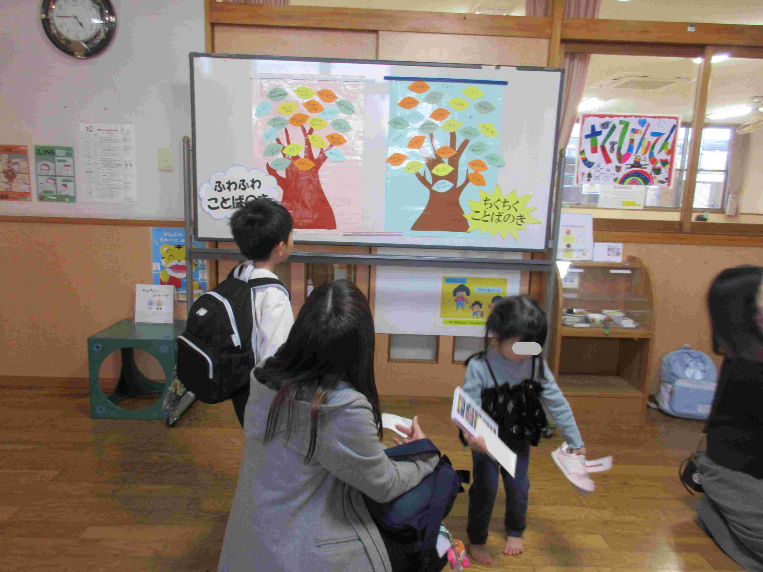集会後はふわふわことばの木、ちくちくことばの木を玄関前に飾りました。「今日、ふわふわとちくちくの話があったんだよ」と親子で話す様子が見ら、関心の高まりを感じました。