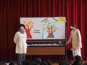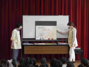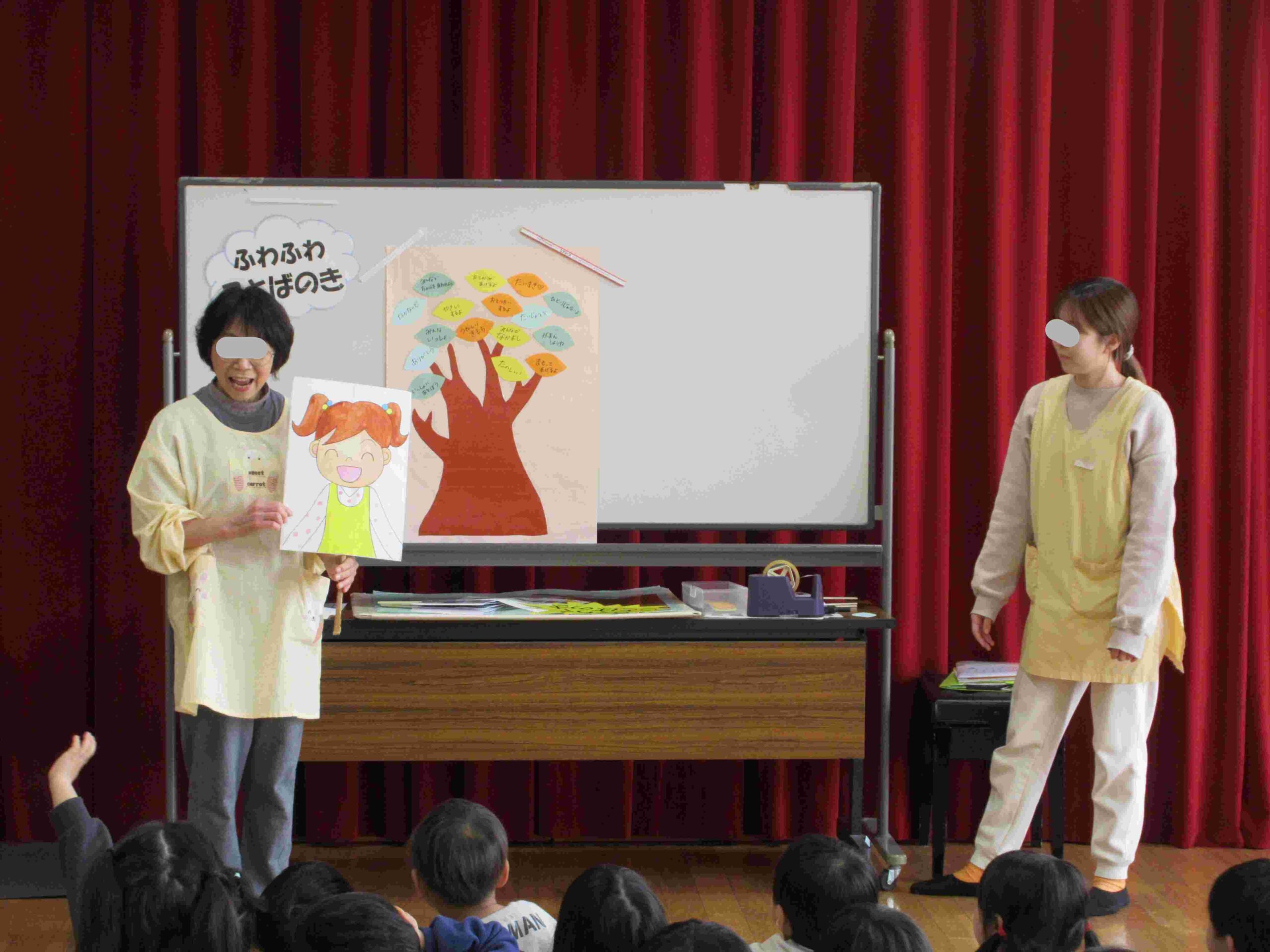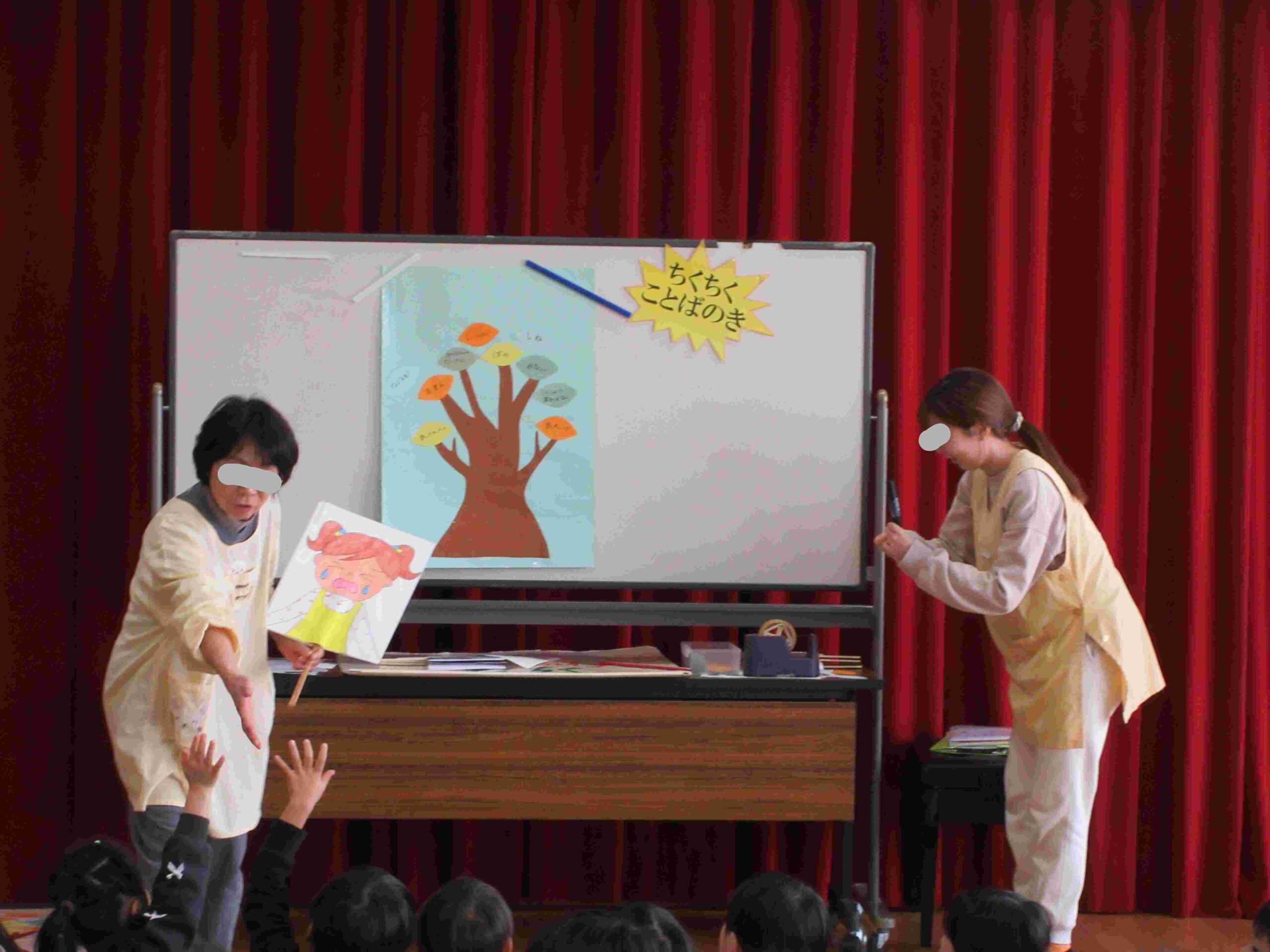 人に言っても言われてもうれしい気持ちになる言葉は『ふわふわことば』、人に言っても言われてもかなしい気持ちになる言葉は『ちくちくことば』ということを子どもたちに分かりやすく伝えるため紙芝居で紹介しました。