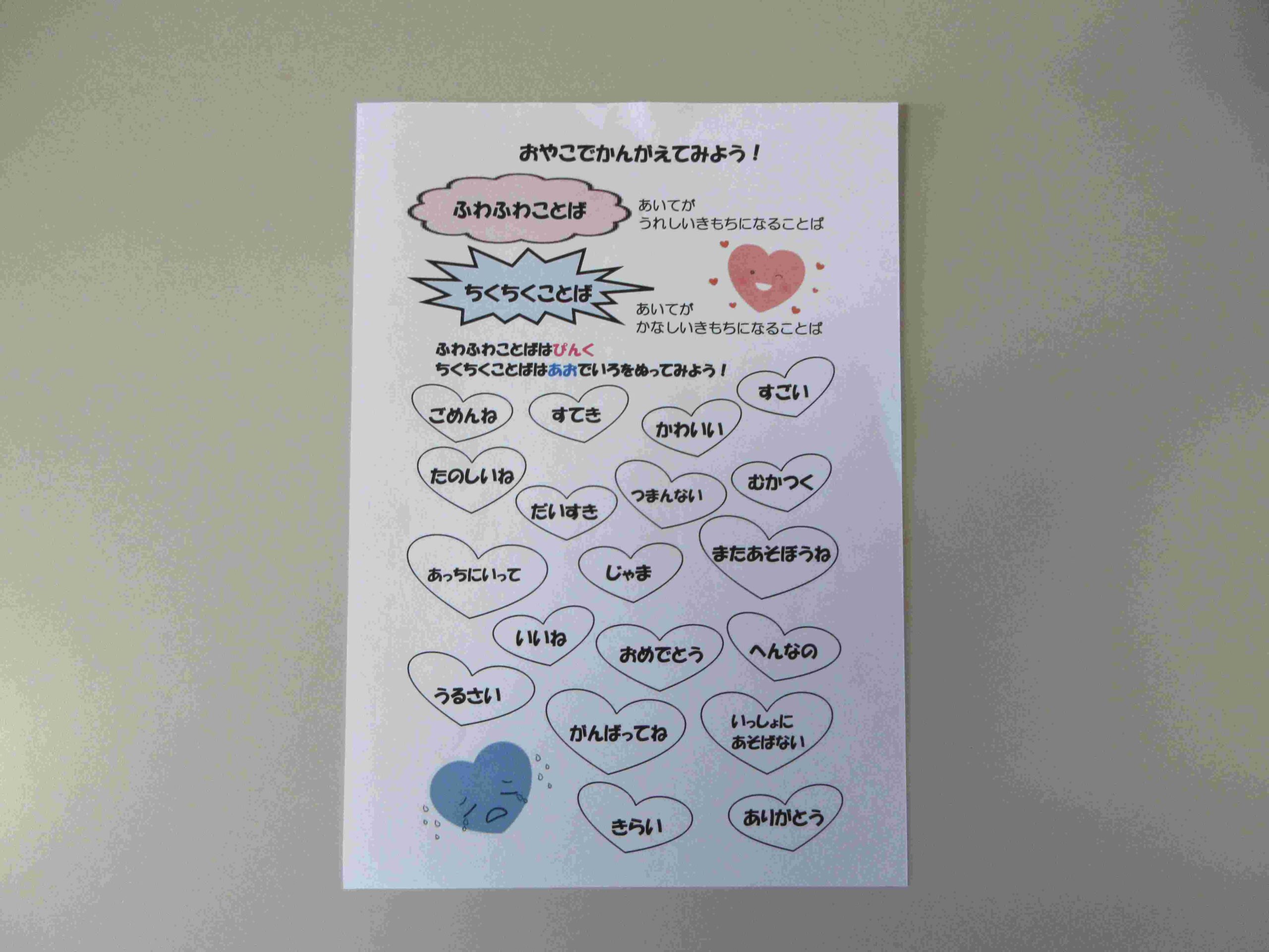 また、『ふわふわことば ちくちくことば』のふりかえりプリントを配布しました。親子で一緒に考える時間になればいいなと思います☺