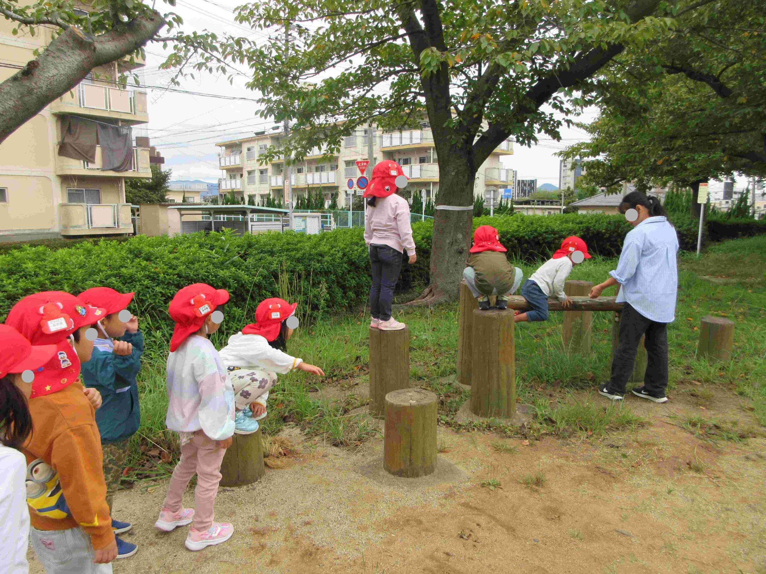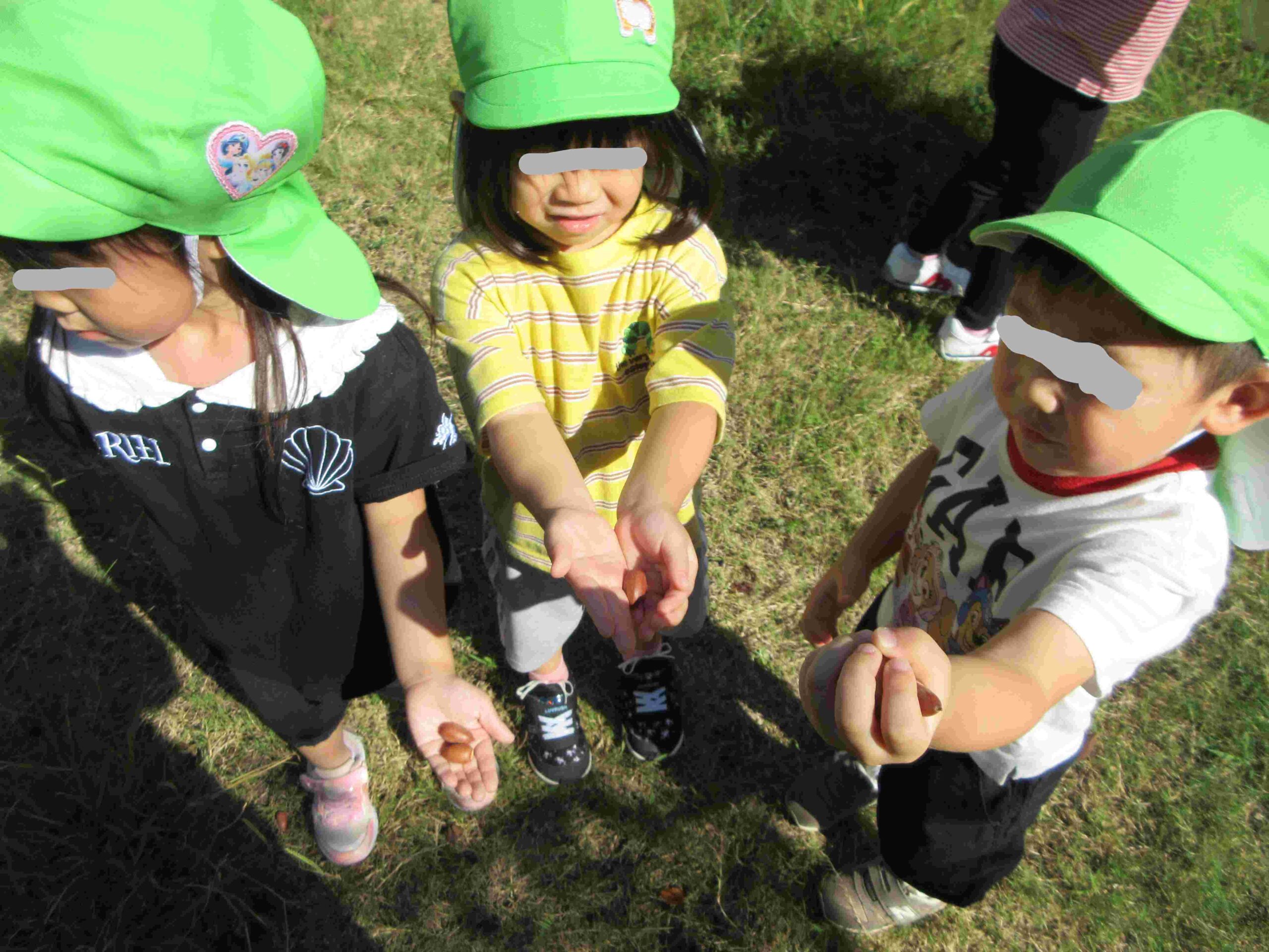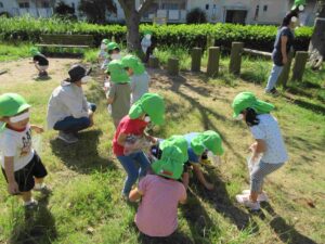 10月17日(金)3歳児は近くの『高坊西公園』に遠足に行きたした。どんぐり拟いに倢䞭になっおいたした。