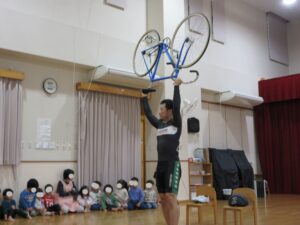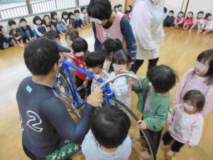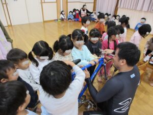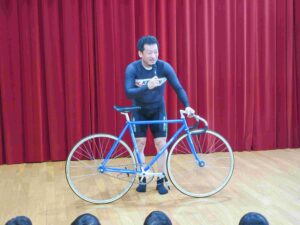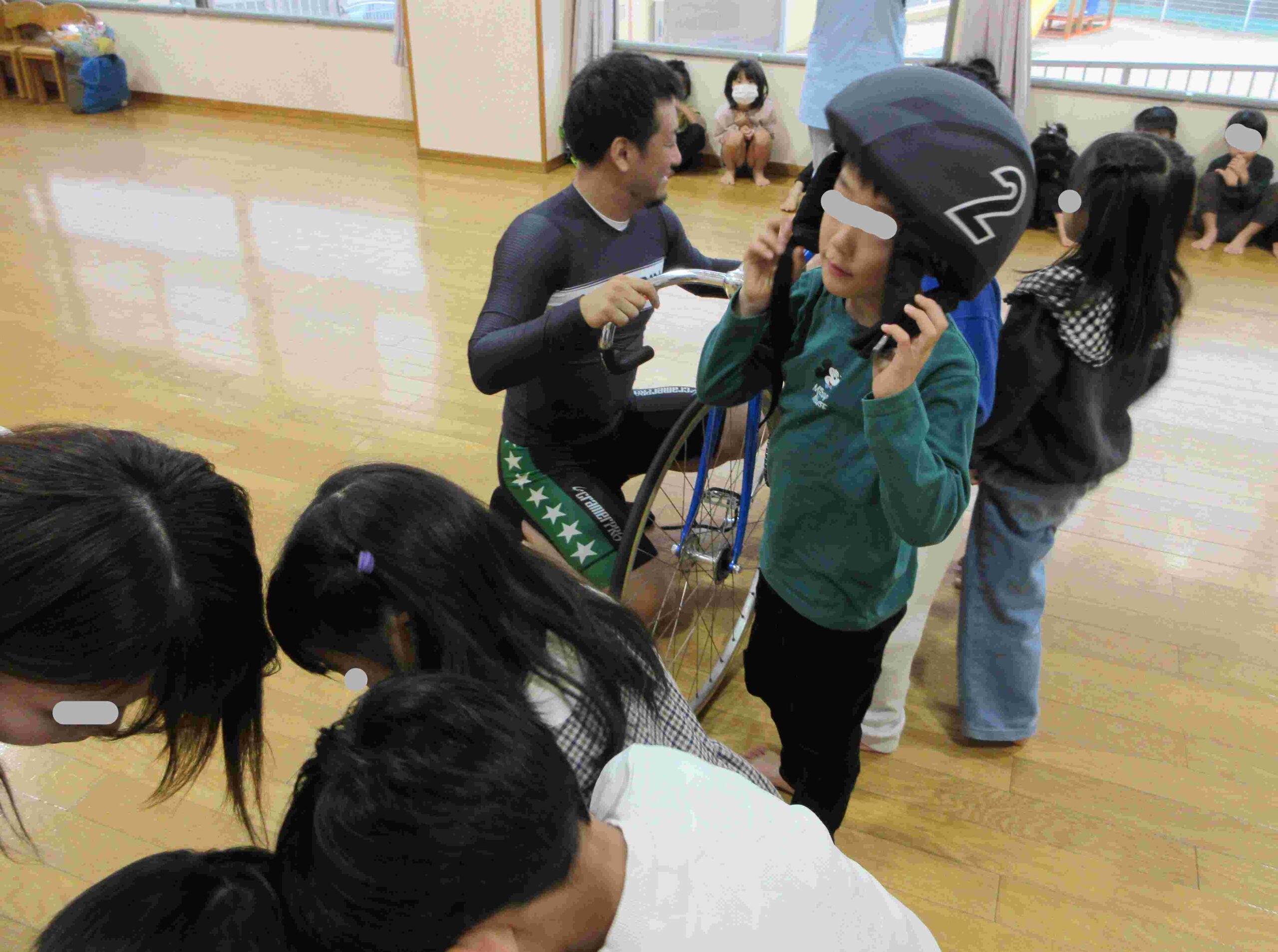 みんなで、自転車や勝利した時のことなど質問した後、実際に自転車とヘルメットと靴を触らせてもらいました。