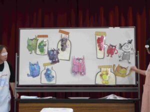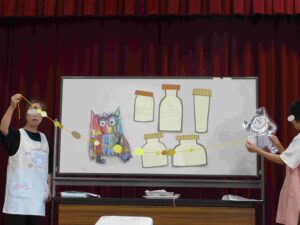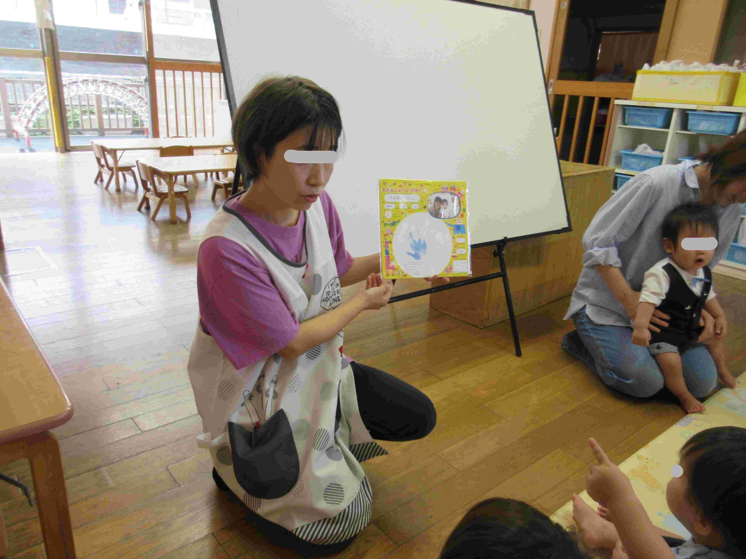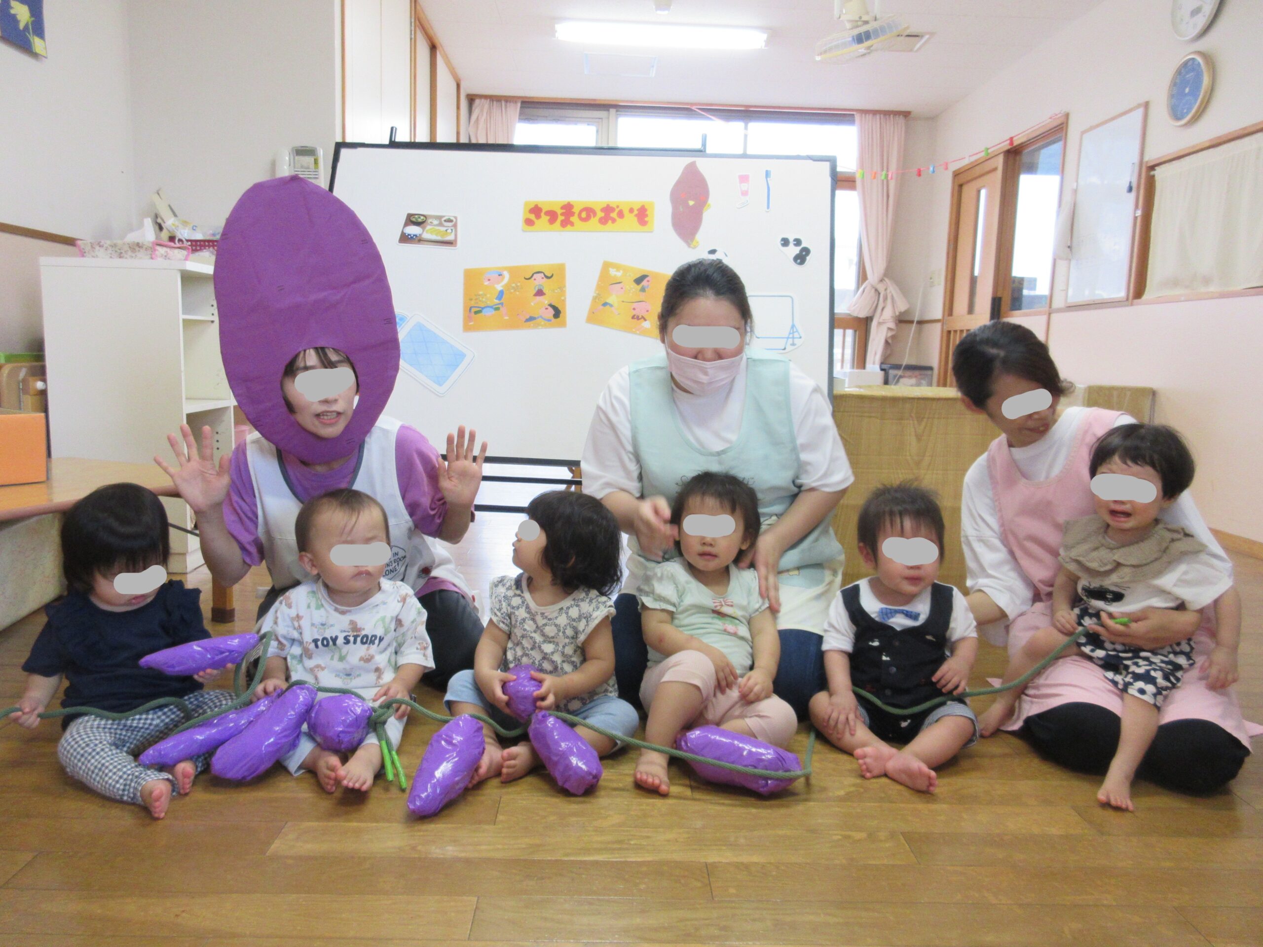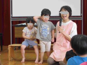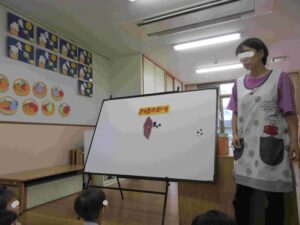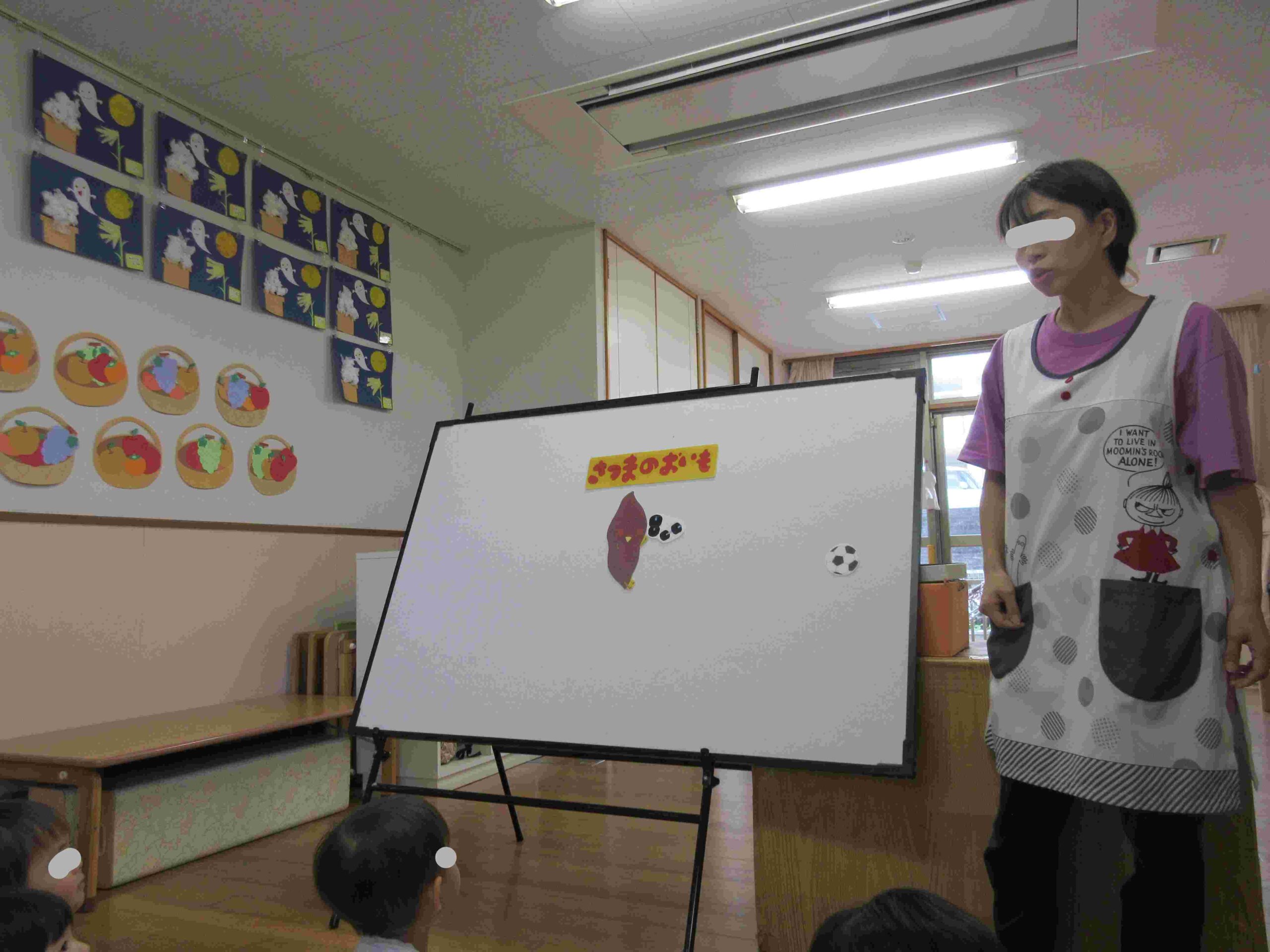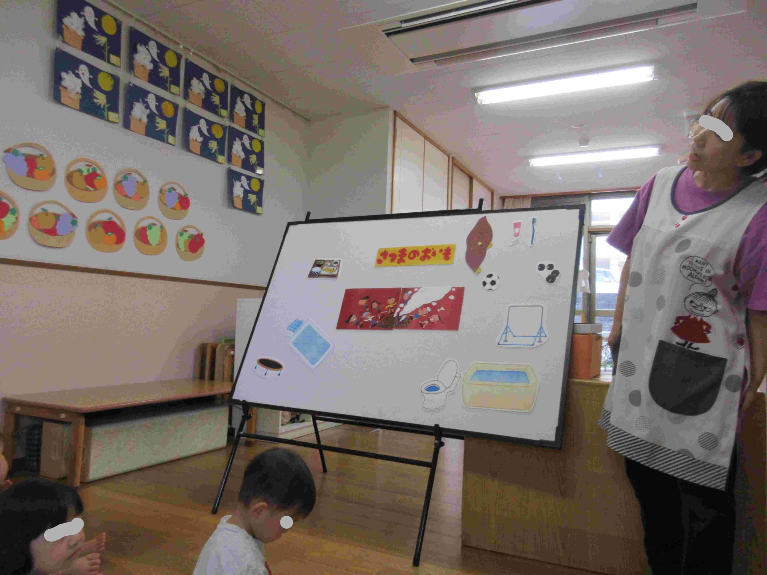 10月の誕生会🍰 ブログ 2025.11.28 10月8日(水)10月の誕生会を行いました。 0・1歳児クラスでは誕生時のお祝い後に、「さつまのおいも」のパネルシアターを観ました。手作りお芋と保育士が被ったお面に興味津々の子ども達でした。 ホールでは、2~5歳児の誕生児をお祝いした後、『カラーモンスター』のお話を見ました。 気持ちを色別に分けることで心の整理ができることを教えてもらいましたよ。じっくりと見入っている子ども達でした。